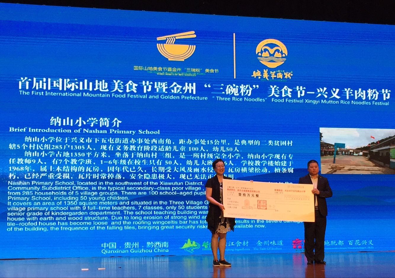 6月28日,在中国饭店协会的扶贫项目——首届国际山地美食节暨金州“三碗粉”美食节上,举行了中国饭店协会捐资助学仪式,南京古南都集团作为中国饭店协会的副会长单位,率先向兴义市下五屯纳山小学捐款拾万元人民币。南京古南都集团执行董事、南京明德慈善基金会理事长姚秋明女士代表集团进行了捐赠。